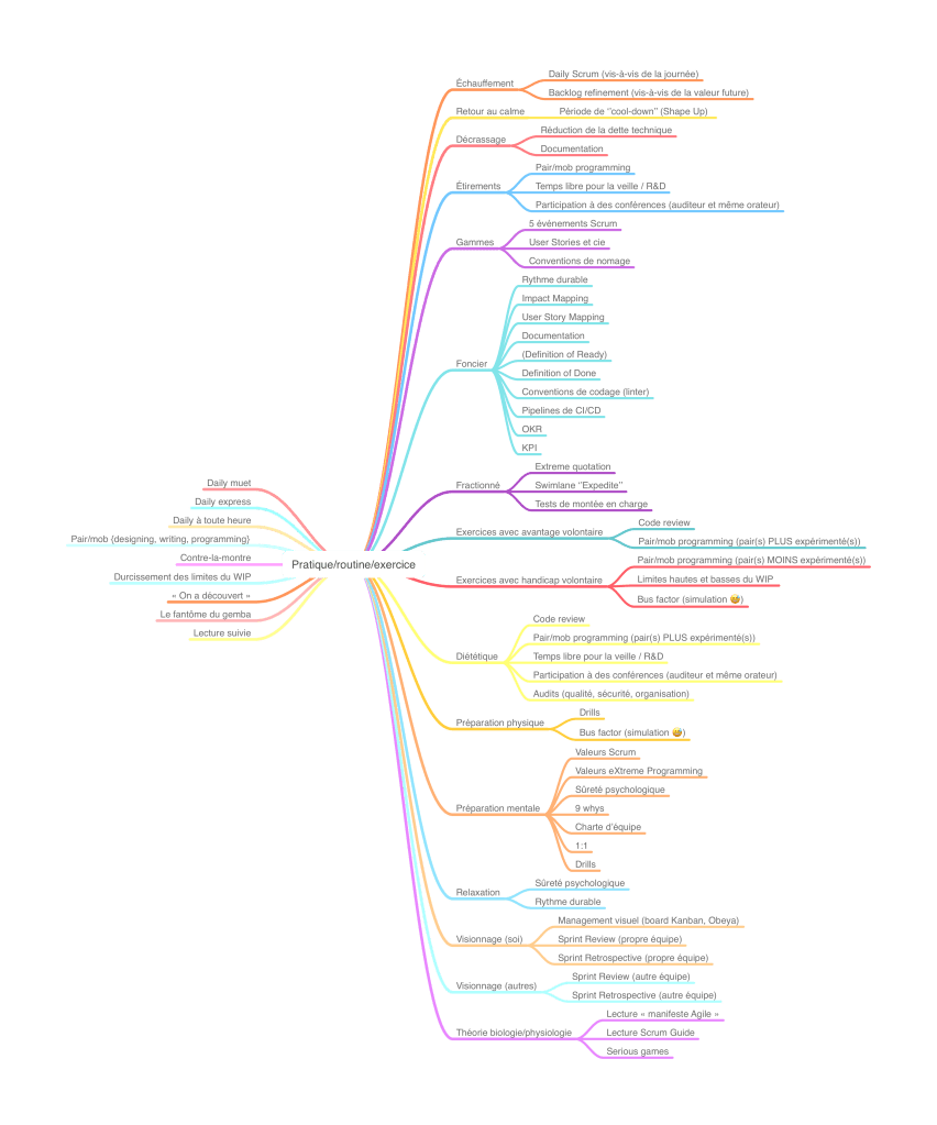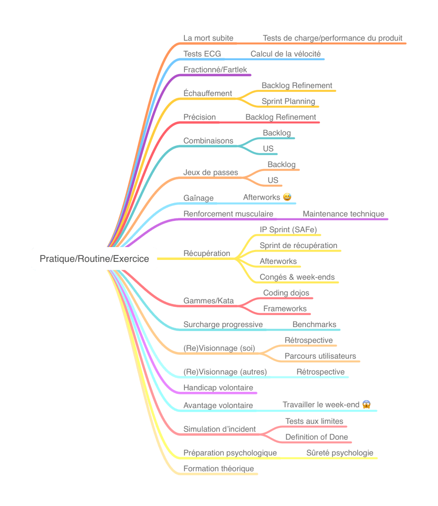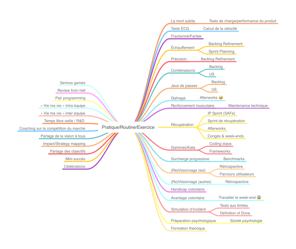 La thématique du sport nous paraît constituer une métaphore intéressante pour introduire des pratiques agiles ou se rappeler l’importance de certaines, car elle parle à « tout le monde ». Par ailleurs, la création coopérative d’une carte mentale nous semble être une approche à la fois pertinente dans le cadre d’un atelier dédié ou, même, d’une rétrospective en ce sens qu’elle est très visuelle et permet de faire des liens. En fin de course (pun intended 😅), l’intention est de stimuler l’envie de progresser des équipiers en excitant leur fibre sportive :